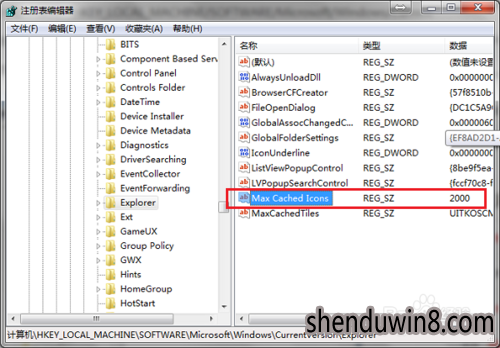 4:第四步在Explorer的右侧找到“Max Cached icons”,双击进去,如果没有这一项的话,鼠标右键Explorer新建->字符串值,如下图所示: