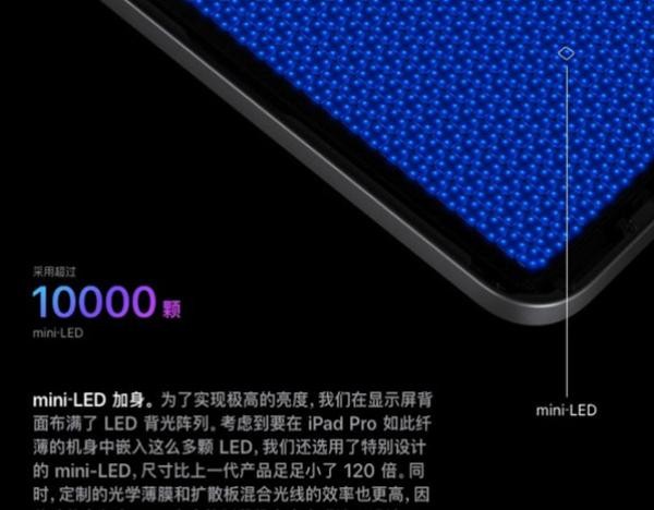 2021款iPad Pro,12.9英寸版还运用了用mini-LED屏,显现亮度方面ipad Pro 2021最高为1600nit,高亮度能够在强太阳光下面看屏幕更舒适。