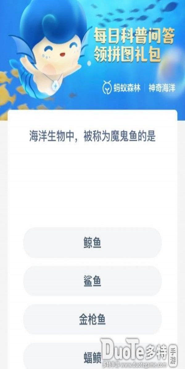 神奇海洋6月15日谜底是甚么,被称为魔鬼鱼的是鲸鱼沙鱼金枪鱼照样蝠鲼,神奇海洋是付款宝蚂蚁丛林中推出的新玩法,除了搜集能量栽培外,还可以经由过程答题等一系列玩法来获得免费的海洋碎片,集齐碎片就能够合成啦,喜爱的小伙伴赶快来看看神奇海洋6月15日谜底最新吧。