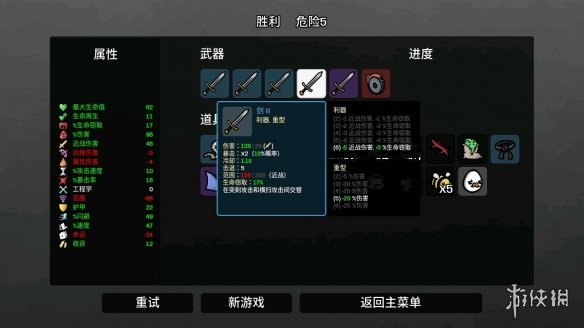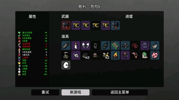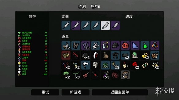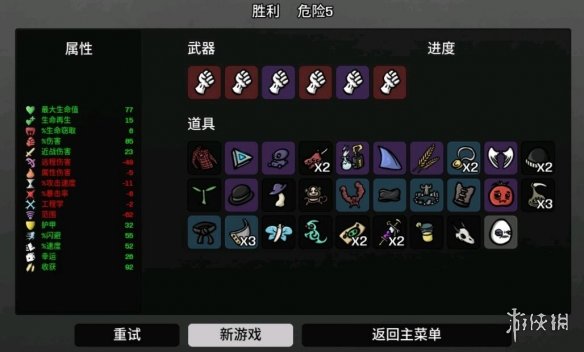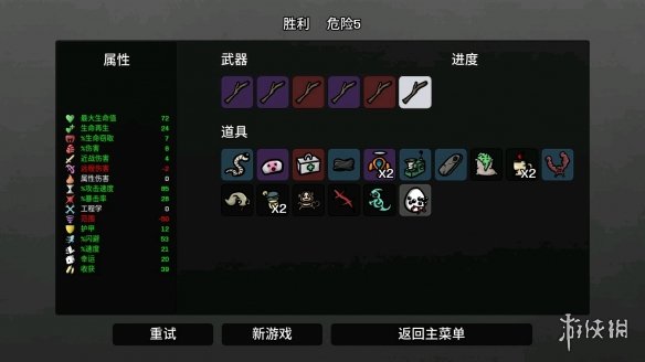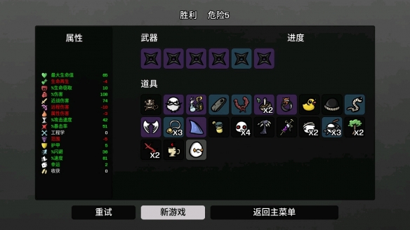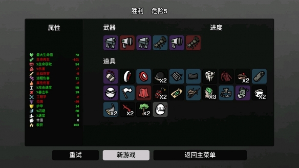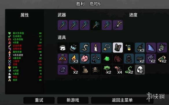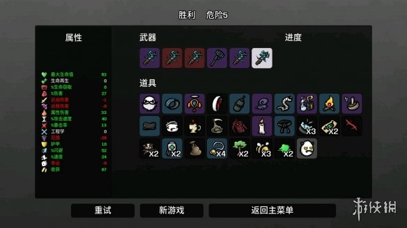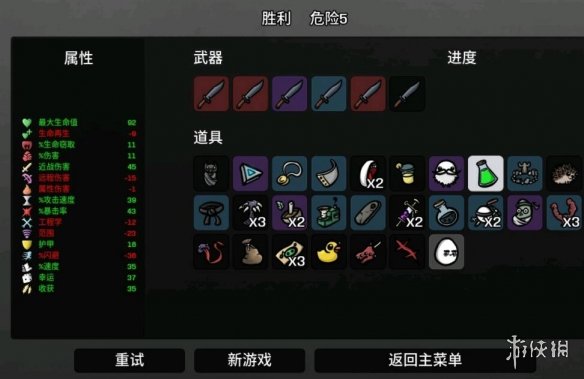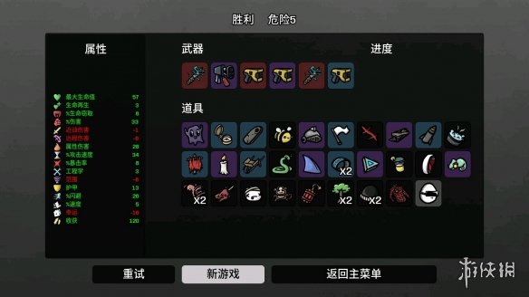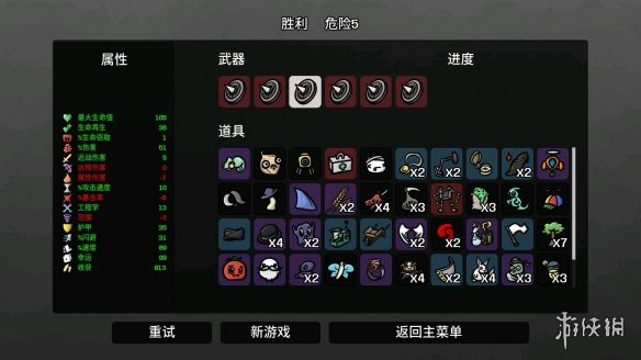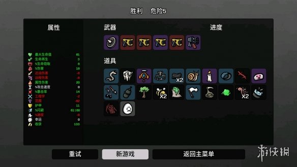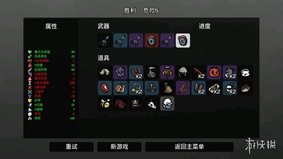 开局一个石头,敷衍拿一个武器。尔后打完第一波买了石头,刷一下望见了盾牌,武断抓了。背后便是拿盾牌,叠成效,尔后叠退守移速回复,就轻巧过了。