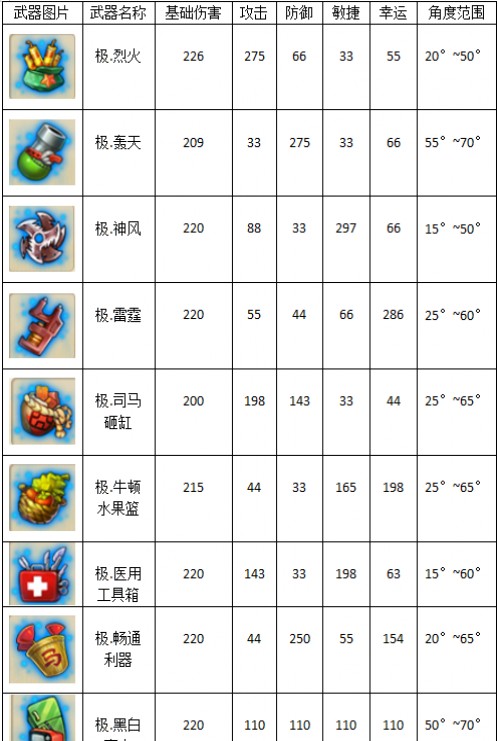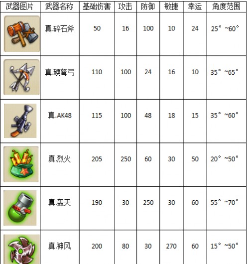 分歧的武器含有的有用袭击角度,基本伤害属性、袭击、退守、迅速、幸运属性均不一致,爆发的袭击效果也各有特色。