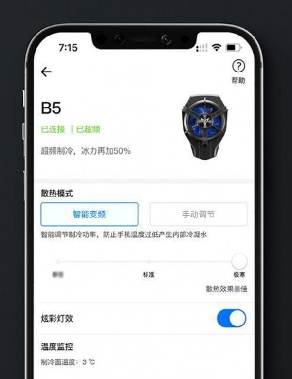 目前好多产品都慢慢执行智能化,这款飞智B5散热器也一样,它有着专属的APP操纵散热器,在衔接后,就能在手机上调节约冷强度以及档位,十分简单上手,轻松玩转你的散热器。