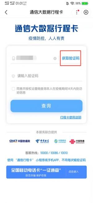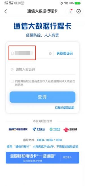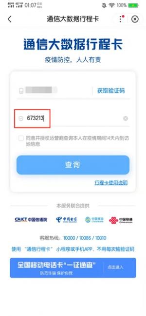 在通讯大资料旅程卡的界面中,输入获得的考证码。