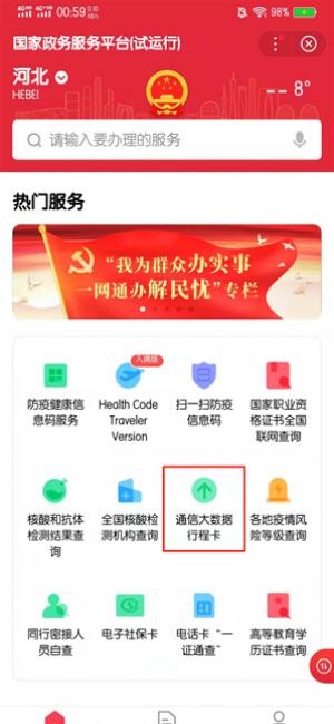 在国度政务服务平台的界面中,点击通讯大资料旅程卡。