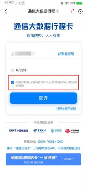 勾选赞同并授权经营商查询本人在疫情期间14天内到访地信息以后,点击查询便可。