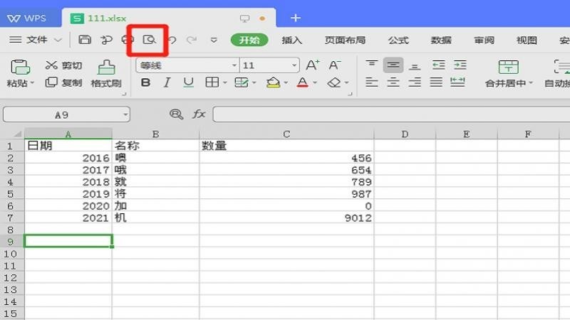 在WPS表格页面中,点击顶部的打印预览。