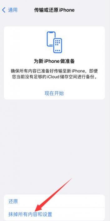 点击传输或还原iPhone,点击抹掉一切内容和配置,抉择持续,依据提醒达成便可。