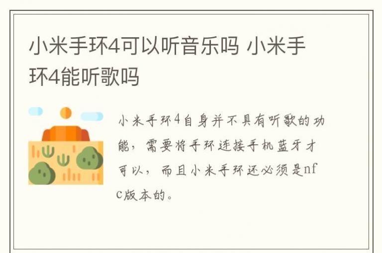 小米手环4自己是不同意听歌的,需求手环衔接手机蓝牙,尔后播放音乐的时候手环上能够看到播放的歌曲,能够在手环上加减音量。需求维持小米行动后台运转。同时小米手环必需是nfc版本才同意。
