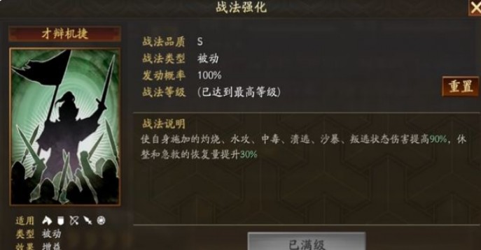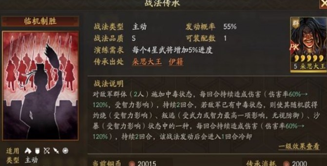 新战法“临机制胜”讲解:“对敌军群体( 2人)施加中毒状况,每回合接续变成妨害(妨害率60%→120%,