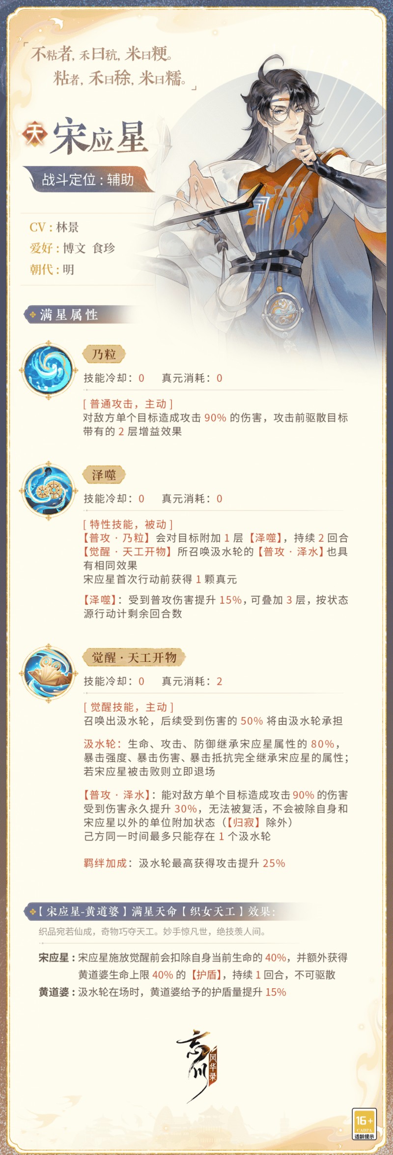 宋应星在忘川中对打作为辅助出战!普遍抨击,对敌方单个对象变成伤害,并在抨击前驱散对象带有的两层增益。特征技能会为普攻命中对象附加一层【泽噬】效果,后续该对象受到普攻伤害提高15%,可叠加3层,觉醒技能召唤的汲水轮普攻也会还有异样的效果,同时宋应星初度动作前获取1颗真元。觉醒技能会召唤出汲水轮,后续宋应星受到50%伤害由汲水轮继承。汲水轮经受一部分宋应星的属性,但受到伤害长期提高30%,且无奈被再生,同一时间最多生计一个汲水轮。