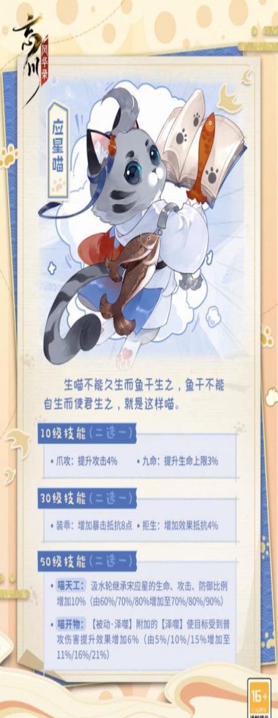 应星喵等级提高至10/30/50级时,会得到不一样的效果提高。等级提高至50级时,便可解锁技能【喵天工】或【喵开物】,大幅提高宋应星的作战才华。宋应星作为辅助名流参预忘川,平常袭击能够驱散敌方增益,特征技能能够使敌方受到平常袭击伤害增多,觉醒技能能够召唤汲水轮进行袭击。装备建议:承佑套,猫技能建议第二条,阵容建议宋应星、杨月亮、高长恭、曹植、赵匡胤。