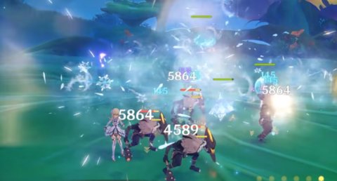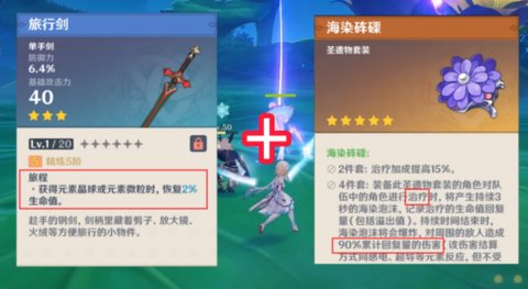 2、这时候可以换上旅行剑(被动获得元素微粒或元素晶球时会给角色回血),圣遗物选择海染套(治疗角色时,会有海染泡沫,一段时间后会爆炸,对敌人造成伤害)。