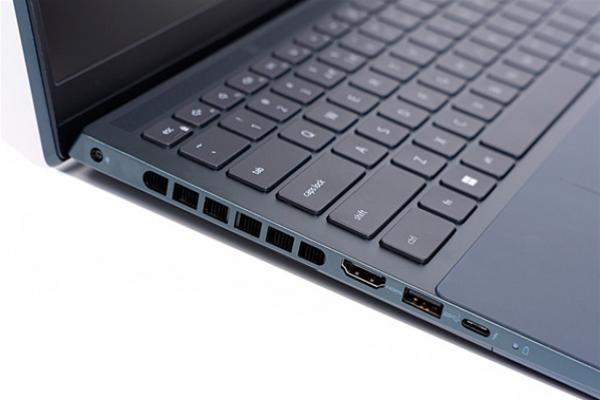 这款笔记本的机身左边策划了一个电源接口、一个HDMI 2.0接口、一个USB3.2 Gen1接口、一个Thunderbolt 4接口、一个电源指示灯。