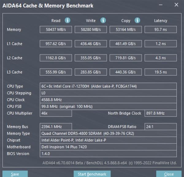灵越14 Plus 7420搭配了两根DDR5内存,以“四通道”模式运转模式。其内存读取、写入、复制的功能均不错。