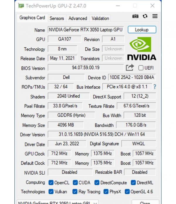 这款RTX3050笔记本电脑GPU的默许GPU频次为712MHz、Boost频次为1057MHz,显存频次为1375MHz(等效11000MHz)。