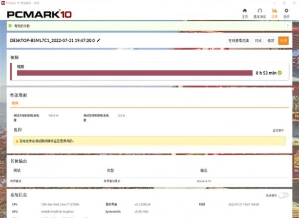 终极,这款笔记本在PCMARK 10视频播放续航项目测试中,实现了8个小时53分的成绩,体现不错。