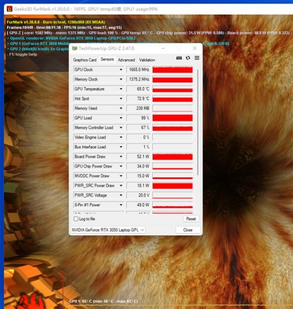 单烤显卡。开启FurMark烤机10分钟以后,这款笔记本的GPU温度稳定在了约65℃阁下,GPU功耗最高可达52W。