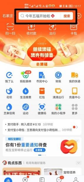 在支付宝界面中,点击顶部搜寻框。
