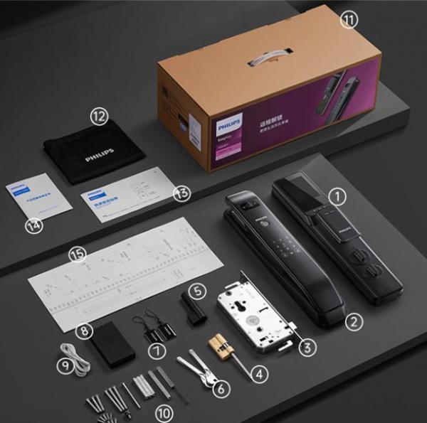 飞利浦的这款DDL303VP智能锁全家福中有锁体、锁芯、钥匙、电池、充电线、操纵指南、合格证、保修书以及一张孔位图。