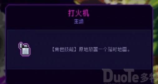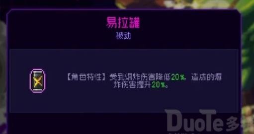 此角色搭配爆炸伤害会有大略45%的加成和简略节略受到的爆炸伤害,技能不算鸡肋,能够前期过渡用,炸点石头箱子,石头门,还是挺好用的。此角色有一个积极技能和一个被迫技能: