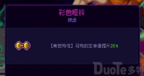 概括:马特机动性比较高,玩得好能够根本无伤,瞬移中接受到弹幕后还能拉满射速。但短处很是致命,此角色血量偏少。道具多配些提高血量上限的就能填补这一短处。不建议新手玩,建议喜爱风骚走位的网友嬉戏。