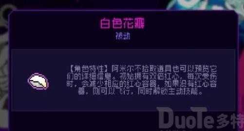 玉.....额不,阿米尔有着玉的外观但没有玉的势力!他原来也不错啦在霓虹的世界里,他有着超等多的血量(固然没什么卵用)和一点盾(盾才是本体我信任)他这个角色的特点是,受伤就减一个红心容器,没有红心容器能够飞天,况且也自带天眼,红心容器没了就只能获得护盾了。能够搭配着献血掉道具掉盾的道具玩,开局先刷点道具。没有红心容器就能使用自动技能了。他有一个自动技能和一个被迫技能。