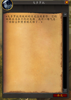 注意:因为戈多罗托会出现在“新兵一日游”支线任务中,因此对于完成“新兵一日游”支线任务的角色,戈多罗托在飞行点西北侧/way 56.49 73.32,对于未完成“新兵一日游”任务线的“偷溜出门”任务的角色,戈多罗托在欧恩伊尔清泉营地内/way 56.76 75.88,虽然位置不同但都可以对话,可能不会影响解密坐骑获取。“新兵一日游”支线任务是[养成坐骑——莉姬,雷脊践踏者]的前置任务线。