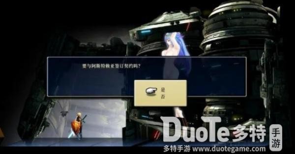 在第四章对打胜利后产生剧情,被传送到有存档水晶的地区,不断向右走碰到了阿斯特赖亚,她让你和他签定订定合同,这边假如拒却的话会干脆BOSS战死亡,以是选择应承。