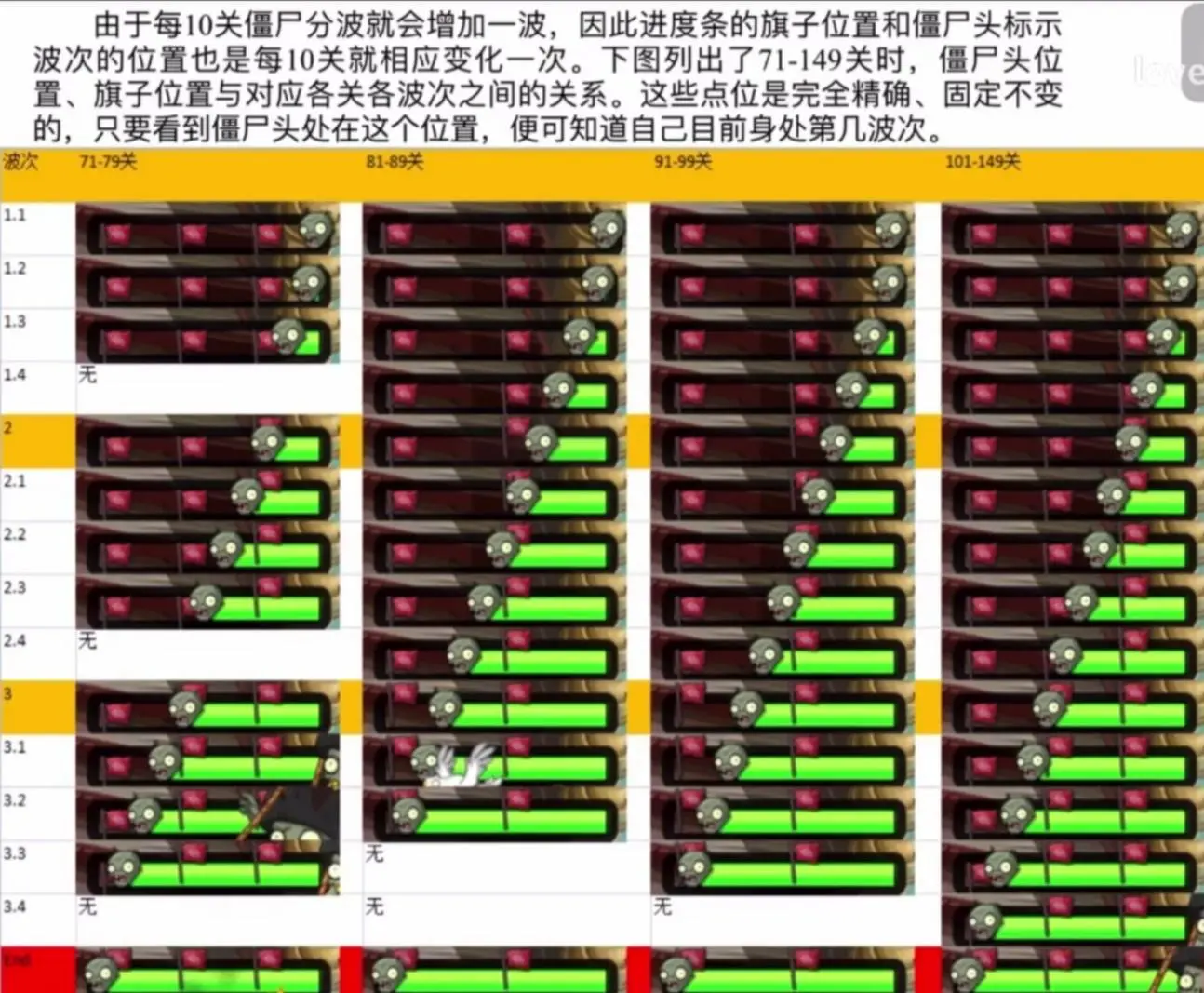 在普通关卡,每个旗子代表一大波,每一大波前有四小波,在第一个旗子前的四小波,我们命名为1.1,1.2,1.3,1.4波,旗子代表的大波为2.0波,之:以此类推,其中,1.4波有被称为旗前小波,这一波比较特殊,之后再说。