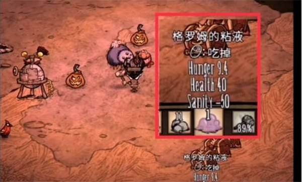 格罗姆每过一段时间就会自动开始生产粘液,这些粘液在饥荒中是一种非常好用的燃料,我们可以把它生产出来的这些粘液收集起来,制作成生产燃料,以供后面使用。可以帮助我们更好地度过黑夜。