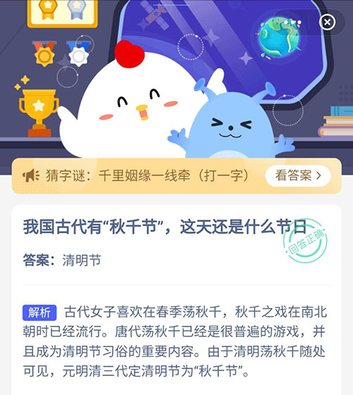 我国古代有秋千节这天还是什么节日 支付宝蚂蚁庄园3月17日答案