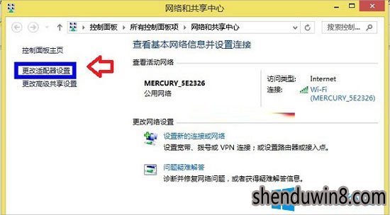2、以后大家便可进入win10网络和共享中心界面,然后大家选中左侧的“更改适配器设置”。