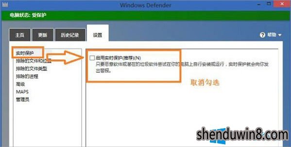 2、进入windows Defender以后,打开“设置”进入“实时保护”的设置中,将“启用实时保护(推荐)”这个选项前面的选项狂取消,然后打开保存确定。