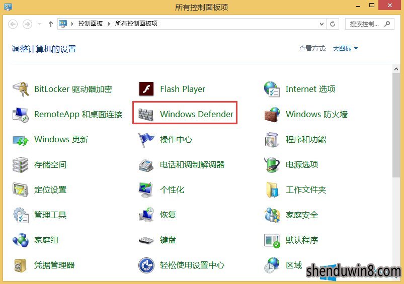 1、鼠标滑动到win10桌面的右侧,点击Metro菜单,打开选中“控制面板”点击,并按照“大(小)图片”的方式查看,大家能在靠前排的图片中找到windows Defender图片,打开进入。