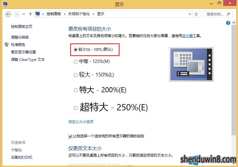 3、在跳出的“显示”面板,将“更改所有项目大小”,这里大家选中“较小-100%”,打开“应用”。