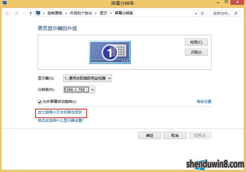 2、在“屏幕分辨率”面板中,大家选中底部的“放大或缩小文本和其他项目”选项。